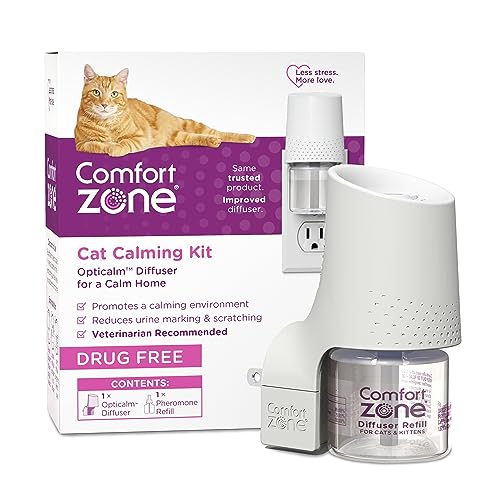 If your cat is urine marking, peeing outside the litter box, scratching furniture, or acting excessively nervous or withdrawn, the Comfort Zone Cat Calming Diffuser is designed to help support calmer, more relaxed behavior at home. Stress from changes such as new environments, unfamiliar visitors, or introducing a new pet can show up as unwanted behaviors, creating ongoing needs for cat stress relief. This plug-in cat calming pheromone diffuser works as a pheromone diffuser to calm cats by releasing a continuous, fragrance-free and drug-free mist that mimics natural feline pheromones. Cats instinctively recognize these calming pheromones for cats as familiar and reassuring. When cats feel safer in their environment, they are more likely to relax, act more affectionate, and settle into normal routines. With consistent use, this calming cat diffuser helps support cat stress relief and improved everyday behavior. Many households notice calmer behavior within about one week. Designed for easy, everyday use, the Comfort Zone Cat Calming Diffuser provides 24/7 calming support for up to 30 days when used with Comfort Zone diffuser refills. Each cat diffuser and refill is designed to cover one room, making it easy to target areas where your cat spends the most time. The diffuser operates quietly and features a small, low-profile design that blends discreetly into your home. Easy to use and mess-free, Comfort Zone Cat Calming Diffusers are expert recommended and tested to meet electrical safety standards. Comfort Zone also offers a full line of cat calming products, including calming collar for cats and cat calming spray, so you can choose the right solution for your cat’s needs and lifestyle. Comfort Zone Cat Diffuser Refills are available in 1, 2, 3, and 6 packs.