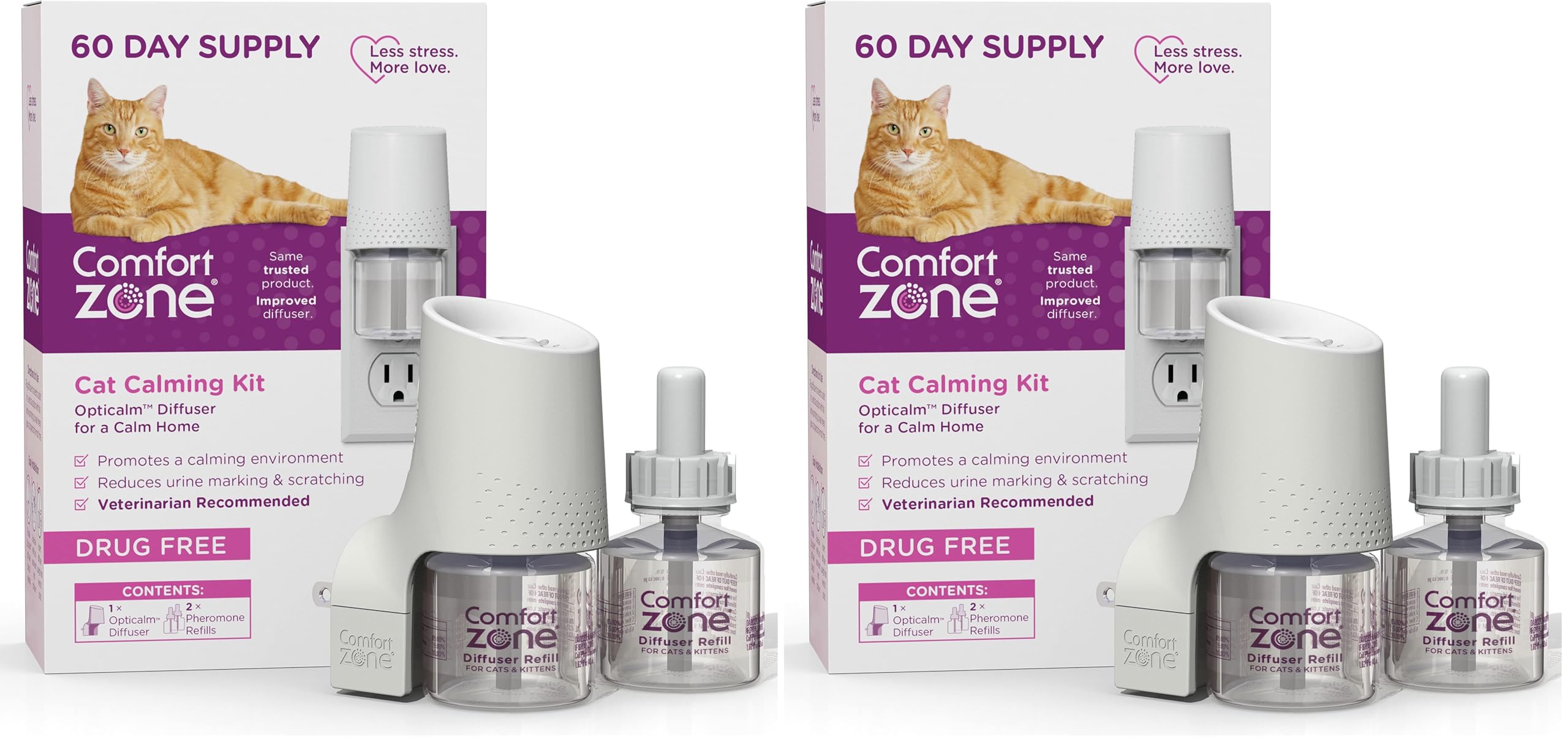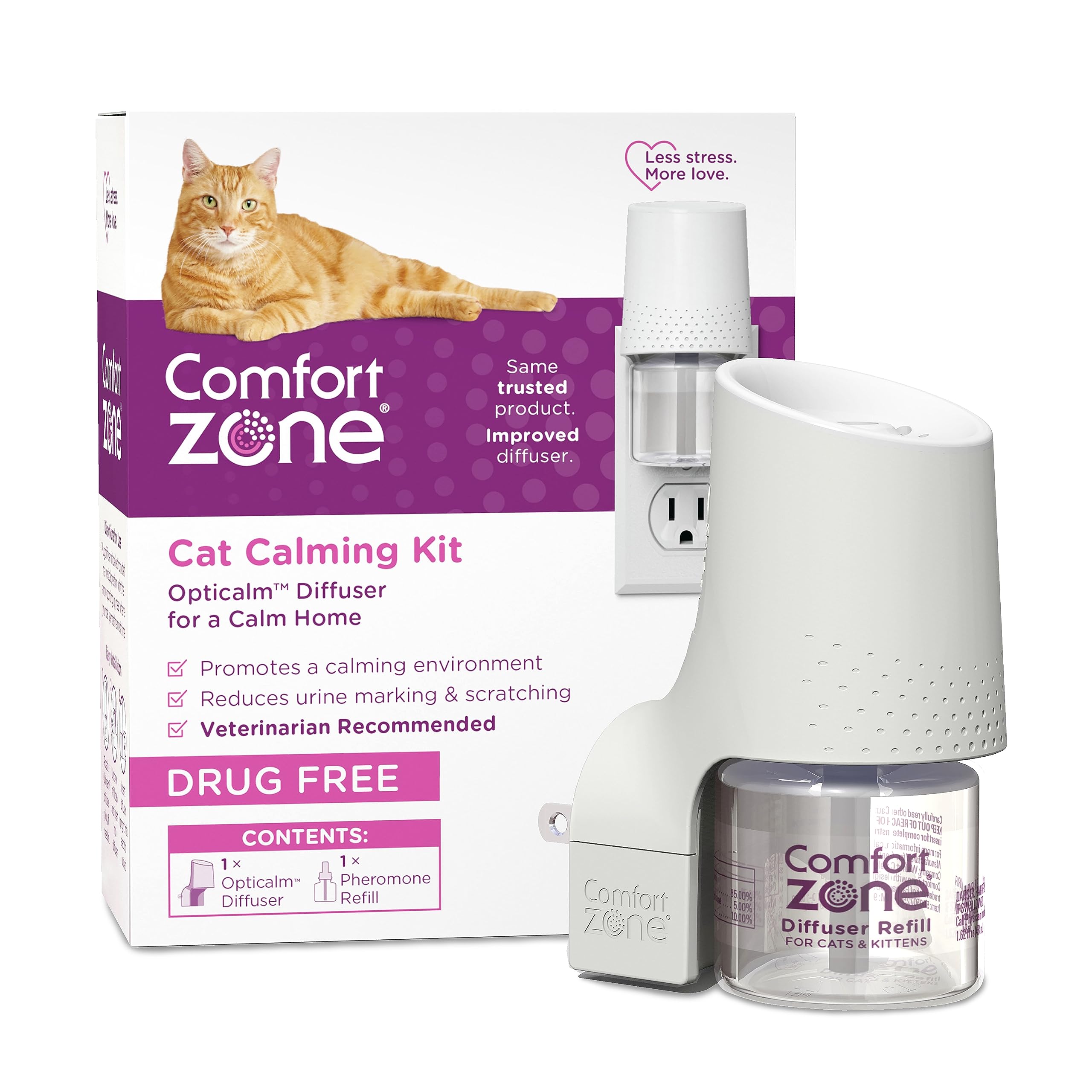 If your cat is urine marking, peeing outside the litter box, scratching furniture, or acting excessively nervous or withdrawn, the Comfort Zone Cat Calming Diffuser is designed to help support calmer, more relaxed behavior at home. Stress from changes such as new environments, unfamiliar visitors, or introducing a new pet can show up as unwanted behaviors, creating ongoing needs for cat stress relief. This plug-in cat calming pheromone diffuser works as a pheromone diffuser to calm cats by releasing a continuous, fragrance-free and drug-free mist that mimics natural feline pheromones. Cats instinctively recognize these calming pheromones for cats as familiar and reassuring. When cats feel safer in their environment, they are more likely to relax, act more affectionate, and settle into normal routines. With consistent use, this calming cat diffuser helps support cat stress relief and improved everyday behavior. Many households notice calmer behavior within about one week. Designed for easy, everyday use, the Comfort Zone Cat Calming Diffuser provides 24/7 calming support for up to 30 days when used with Comfort Zone diffuser refills. Each cat diffuser and refill is designed to cover one room, making it easy to target areas where your cat spends the most time. The diffuser operates quietly and features a small, low-profile design that blends discreetly into your home. Easy to use and mess-free, Comfort Zone Cat Calming Diffusers are expert recommended and tested to meet electrical safety standards. Comfort Zone also offers a full line of cat calming products, including calming collar for cats and cat calming spray, so you can choose the right solution for your cat’s needs and lifestyle. Comfort Zone Cat Diffuser Refills are available in 1, 2, 3, and 6 packs.