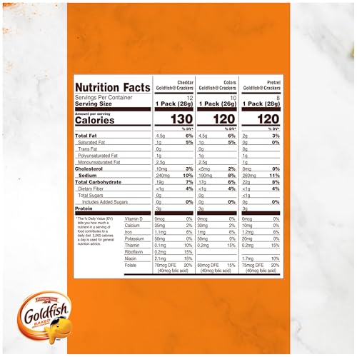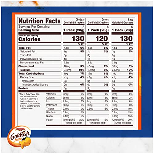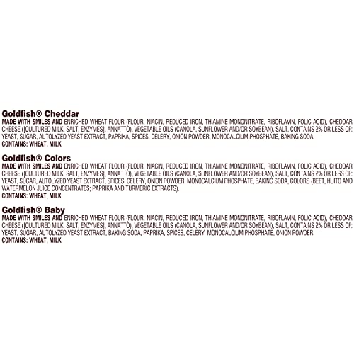 Product Description The irresistible little snack that always delights. This assortment of munchable, crunchable snack crackers includes Goldfish Cheddar, Goldfish Colors Cheddar and tasty Goldfish Pretzels. Goldfish Cheddar and Goldfish Colors Cheddar are baked with 100% Cheddar cheese. Goldfish Pretzels are crisp and delicious. All three flavors are always baked and made with no artificial flavors or preservatives. Talk about a feel-good snack. Goldfish snack crackers are great for lunch as well as snack-time munching. You can also add them to soups or add them as a side with your sandwich. That’s all it takes to whip up a meal that’s tasty and fun. Kids and adults alike love Goldfish crackers, and being able to choose from their favorites is sure to be a big hit with everyone. With 30 single-serve Snack Packs, you’ve made the right choice for lunches, on-the-go snacking and sharing. Expect big smiles all around. Next time you’re craving something delicious, go for the handful. From the Manufacturer New name, same great variety as the Classic Mix! With Goldfish crackers, the smiles come naturally. This Big Smiles variety pack of Goldfish goodness includes all your favorites in single-serving packs: Goldfish Colors (0.9 ounce each), Goldfish Cheddar (1 ounce each) and Goldfish Pretzel (1 ounce each). Always baked, never fried, Goldfish crackers are a snack the whole family will adore. All of our cheese cracker varieties, like cheddar, are baked with real cheese, and Goldfish crackers have no artificial flavors or preservatives, and use colors sourced from plants. This 30-count variety pack is great for on-the-go snacking with individual serving sizes. For Pepperidge Farm, baking is more than a job. It’s a real passion. Each day, the Pepperidge Farm bakers take the time to make every cookie, pastry, cracker and loaf of bread the best way they know how by using simple, quality ingredients.