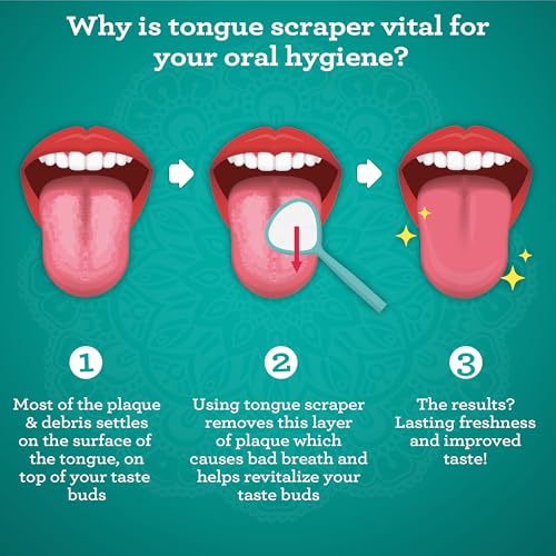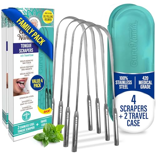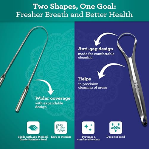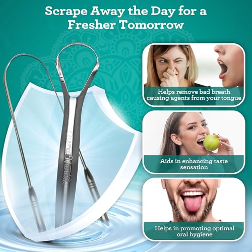 • HELPS PREVENT BAD BREATH: Scraping your tongue twice a day is the best way to prevent bad breath. The GuruNanda Metal Tongue Scraper removes layers of gunk, promoting fresh breath & a confident smile