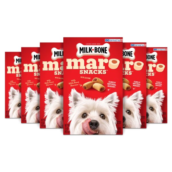 Tap into your dog’s canine heritage and treat them to a few of these savory, crunchy dog treats. They′re dog biscuits, but with a tasty bonus: The biscuit shell encases a real bone marrow center. So they′re crunchy on the outside and meaty on the inside — a mouthwatering, satisfying flavor and texture combo. You′ll also be glad to know that they′re made with calcium and use only natural ingredients as sources of color. In short, Milk-Bone MaroSnacks dog snacks are delicious treats you can feel good about giving. Order now to give your dog the simple, genuine joy that your dog gives you every day.