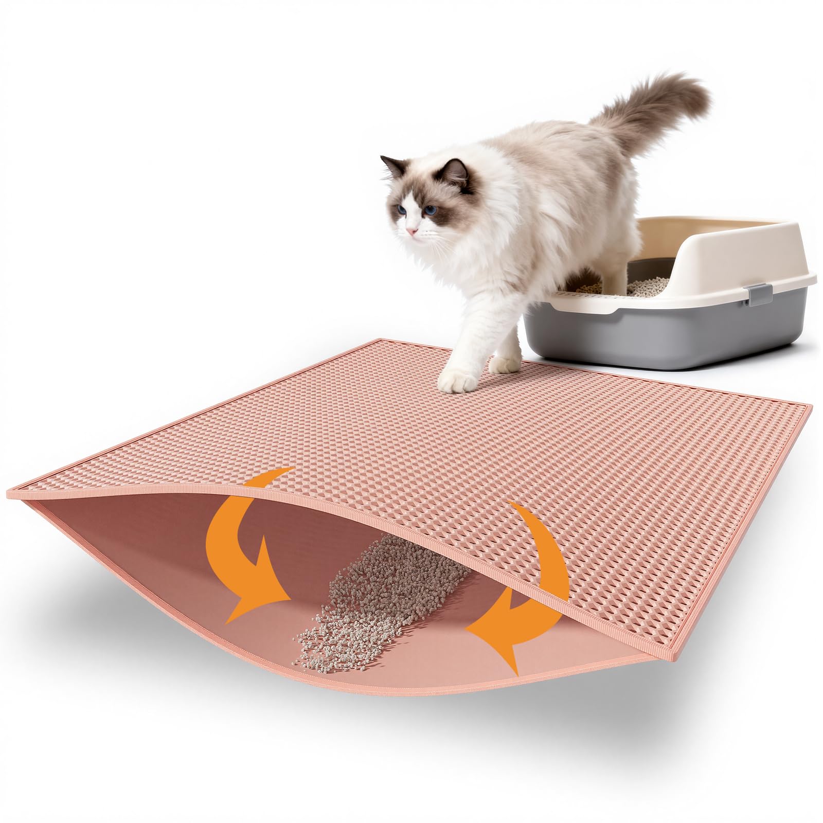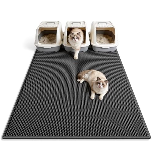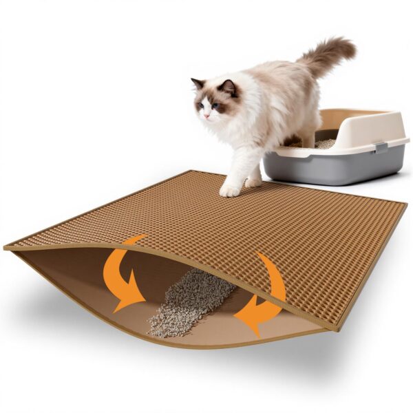 - Anti Tracking EZ Open Edge Litter Mat: Double-layer honeycomb design helps you gather the litter. You just pick up the mat and all the litter falls through and then dump it back in the litter box make it recycling. No more getting litter stuck to my feet on a daily basis! Large holes is large enough to catch and trap litter. Suitable for lots of type of litter, and kitty litter boxes,hooded,self cleaning litter box.