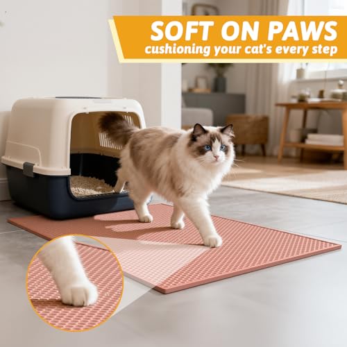- Soft On Paws & Easy To Release Litter: Great litter trapping mat, comfortable on tender paws. Our soft EVA material is gentle for sensitive cat paws. Cats even like to step on or have an afternoon snooze on it. Double layers allow litter to be sifted and gather on the bottom. Shaking gently could release litter easily.