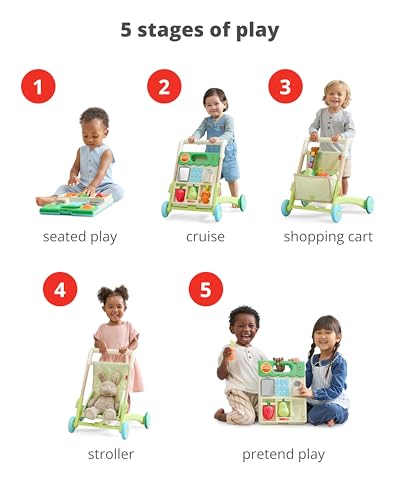 Step right up to farmers market fun in 5 grow-with-me stages! Packed with 50-plus play features, songs, sounds, lights and more, our convertible activity walker helps little ones learn and grow with five interactive ways to play: seated, cruising, shopping cart, stroller and pretend play. Featuring cute fruit, veggies, a light-up coin box, key pad, mirror scale and more farmers market activities, it’s a perfect way to encourage balance, motor skills, cause & effect and more as baby learns, grows and develops for years to come.